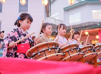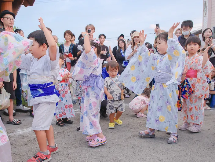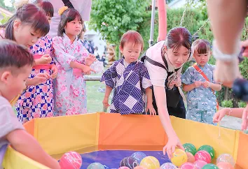 毎年夏の夕べを楽しむ夕涼み会を開催しています。子どもたちは園内に並ぶにぎやかな屋台を楽しみ、みんなで盆踊りを踊り、園の仲間と夏の思い出を作る大切な行事です。