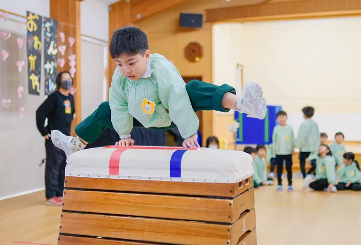 「こども体育研究所」から講師をお招きして、マットや鉄棒、跳び箱など多彩な運動遊びを行います。