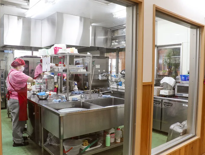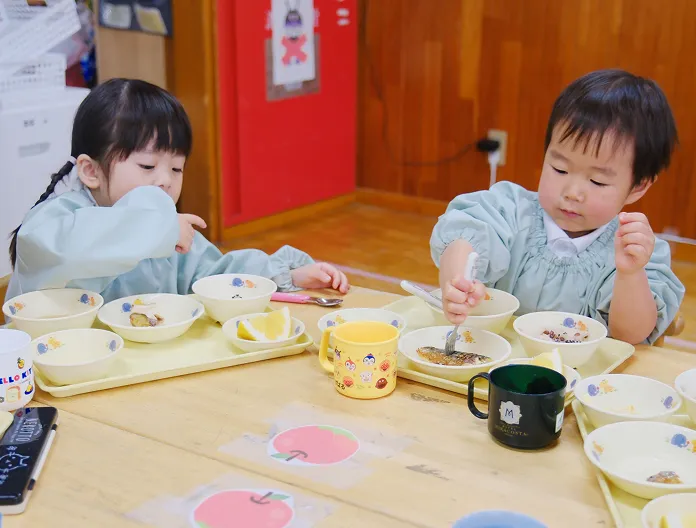 給食は、園内の調理室で手作りしています。和食を中心に3〜5品目を基準とし、栄養バランスが考えられた献立で、できたての温かい食事を提供しています。